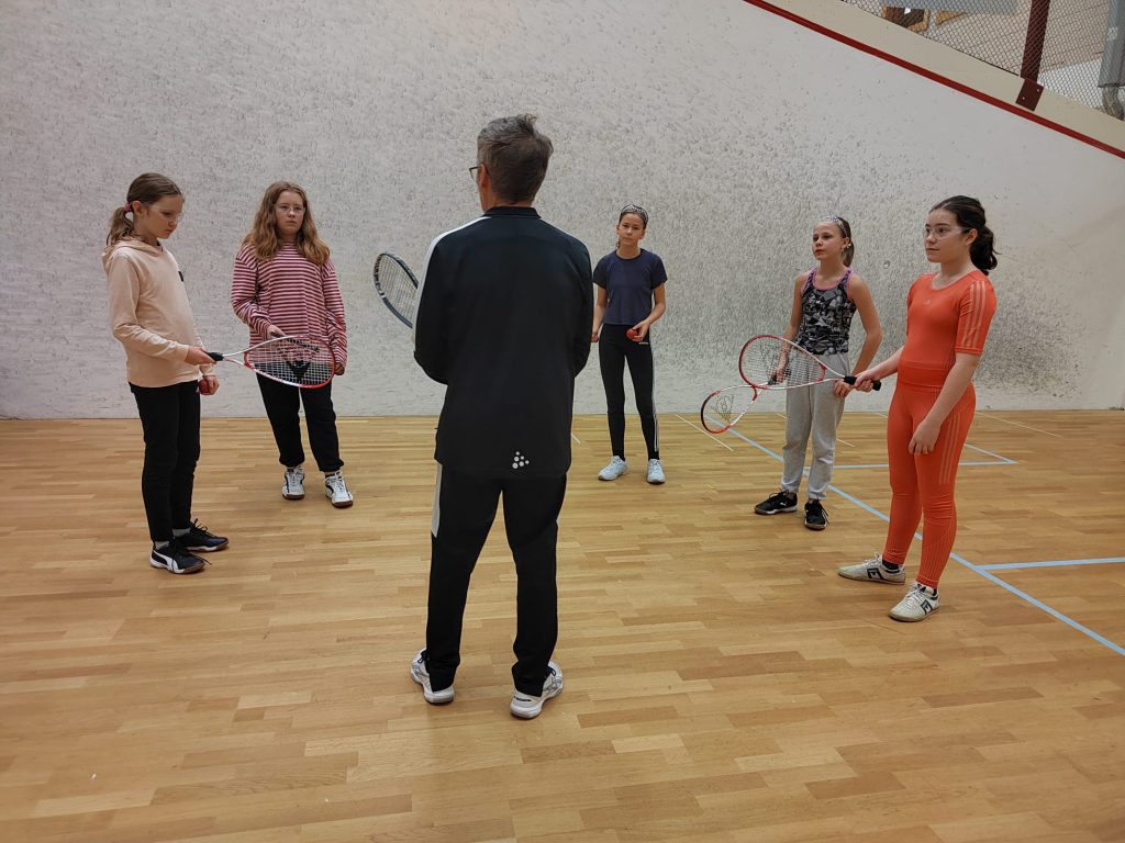 Tunti käytettiin tehokkaasti, ensin tiivis seura- halli ja lajiesittely sekä pelaamisen turvallisuudesta huolehtiminen. Kentillä käytiin perusasiat läpi, mailaotteet, lyönnit, harjoiteltiin pallottelua ja sitten päästiin käsiksi mukavimpaan, eli peliin. Hiki tuli, kivaa oli niin oppilailla, kuin myös Kouvolan Squash-seuran ohjaajilla, Kari, Vesku, Ari, Paavo ja Keijo.