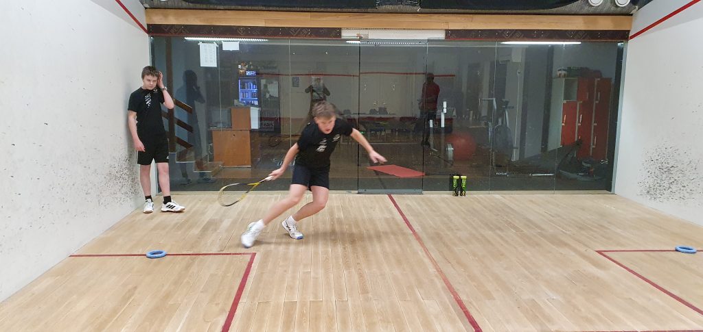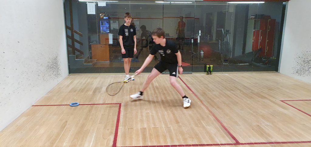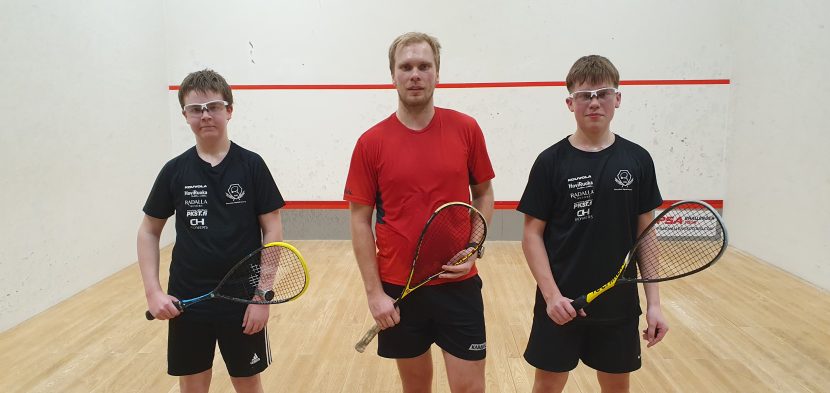 Kouvolan Squash-seuran jo hiemen kokeneemmat juniorit Jaakko Hirvonen ja Leo Lähde treenasivat 15.1.2026 KSQ:n Henrik “Heke” Mustosen johdolla Hollolan Kuntokeitaan hallilla